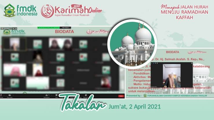FMDKI.ORG, TAKALAR–Forum Muslimah Dakwah Kampus Indonesia (FMDKI) Daerah Takalar bekerjasa sama dengan LDK Al-Mujahidin dan BEM STIKES Tanawali Persada adakan Kajian Ramadhan Ilmiah Muslimah (KARIMAH) Online, Jum’at (02/03/2021).