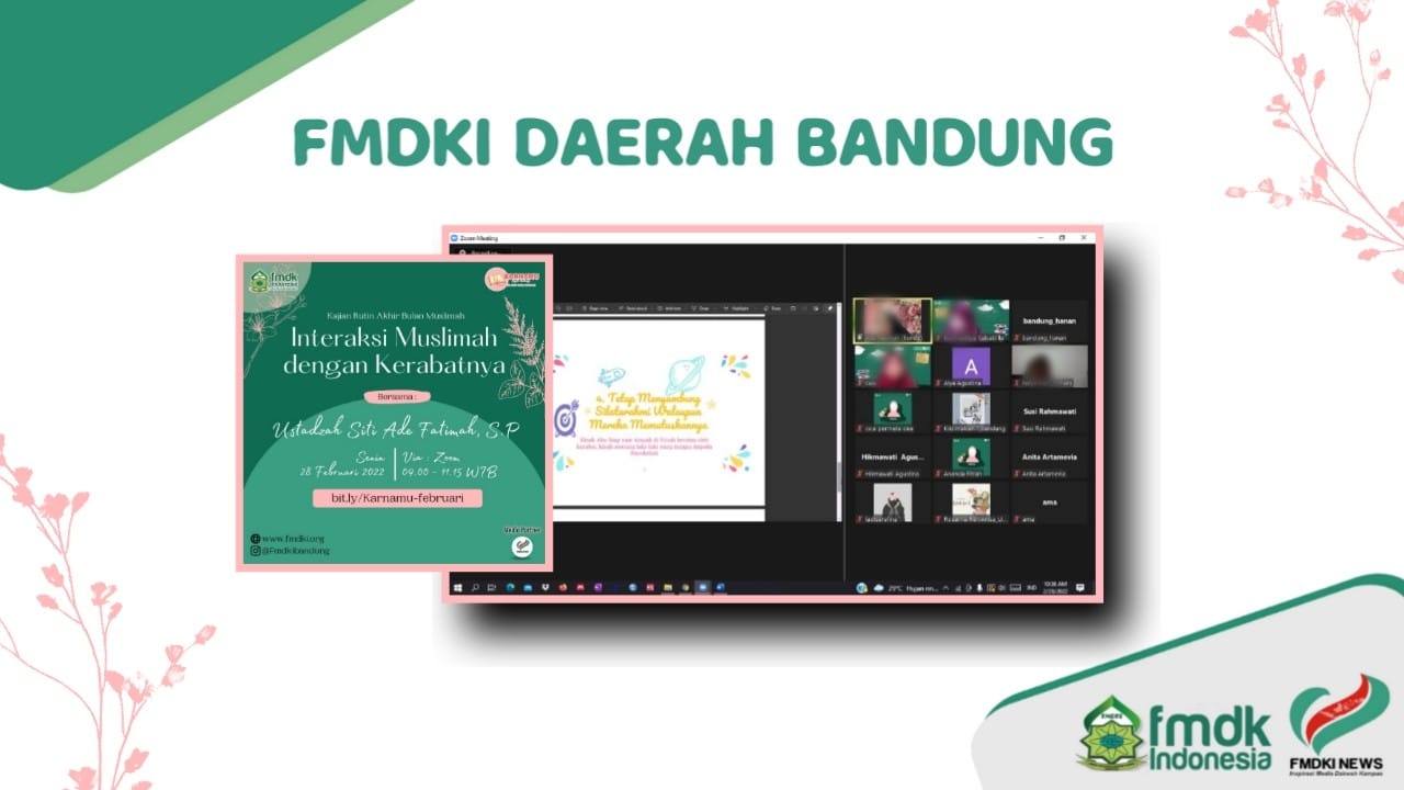 FMDKI.ORG, BANDUNG – Forum Muslimah Dakwah Kampus Indonesia (FMDKI) Daerah Bandung selenggarakan Kajian Rutin Akhir Bulan Muslimah (KARNAMU) dengan tema “Interaksi Muslimah dengan Kerabatnya.” Senin (28/02/22).