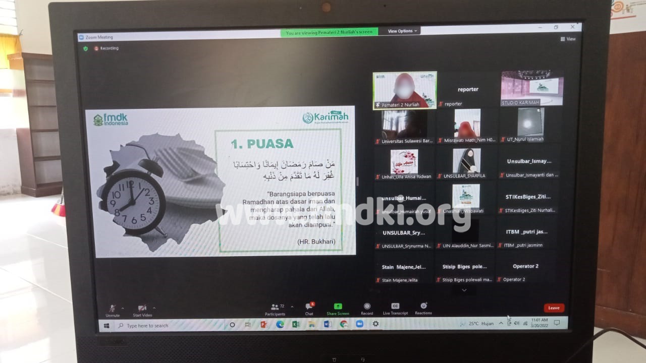 FMDKI.ORG, POLMAN – Forum Muslimah Dakwah Kampus Indonesia (FMDKI) Daerah Polman gelar Kajian Ramadhan Ilmah Muslimah (KARIMAH), Ahad (20/03/2022).