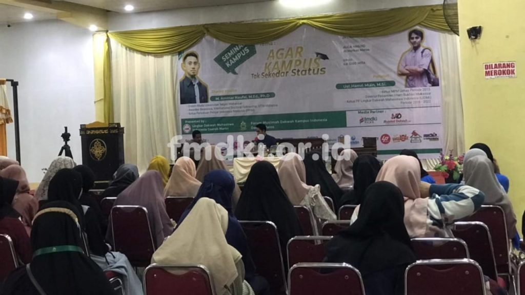 Kegiatan yang mengangkat tema “Agar Kampus Tak Sekedar Status” berlangsung di Aula Masjid Al Markaz Maros yang dihadiri oleh 76 orang mahasiswa.