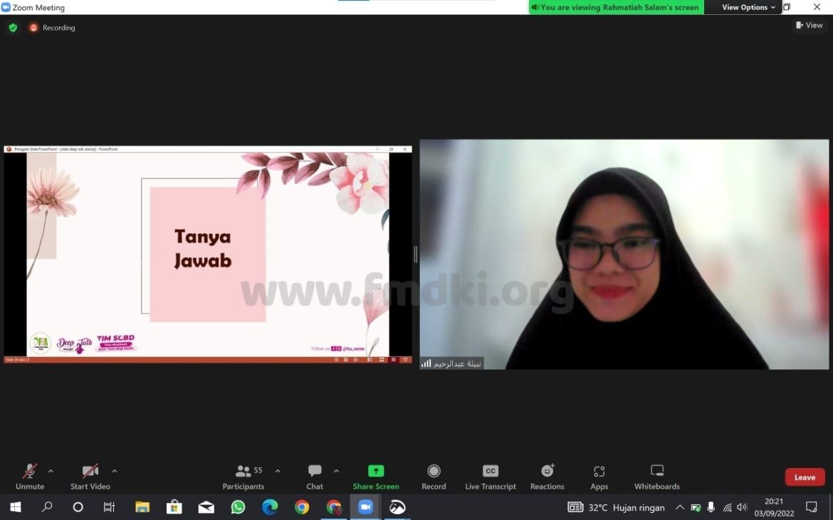 FMDKI.ORG, MANADO – Forum Studi Annisa (FSA) Universitas Negeri Manado (UNIMA) sukses gelar seminar muslimah “Deep Talk Annisa”, Sabtu (03/09/2022). Kegiatan yang mengusung tema “TIM SCBD Tren Muslimah, Syiar Cinta Bagi Dunia” itu berlangsung secara hybrid di Gedung Kuliah Bersama UNIMA dan via Zoom Meeting yang dihadiri oleh 59 peserta. …