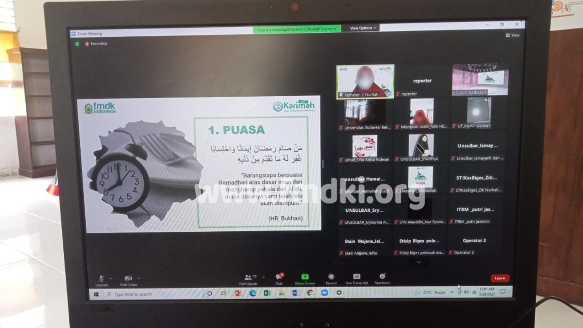 FMDKI.ORG, POLMAN – Forum Muslimah Dakwah Kampus Indonesia (FMDKI) Daerah Polman gelar Kajian Ramadhan Ilmah Muslimah (KARIMAH), Ahad (20/03/2022). Mengangkat tema “Ramadhan Kabarkan Surga yang dirindu (The Best Time to Muhasabah)”, kegiatan berlangsung secara daring melalui Zoom Meeting dan dihadiri oleh 76 partisipan dari berbagai kampus di Sulawesi Barat. Nur …