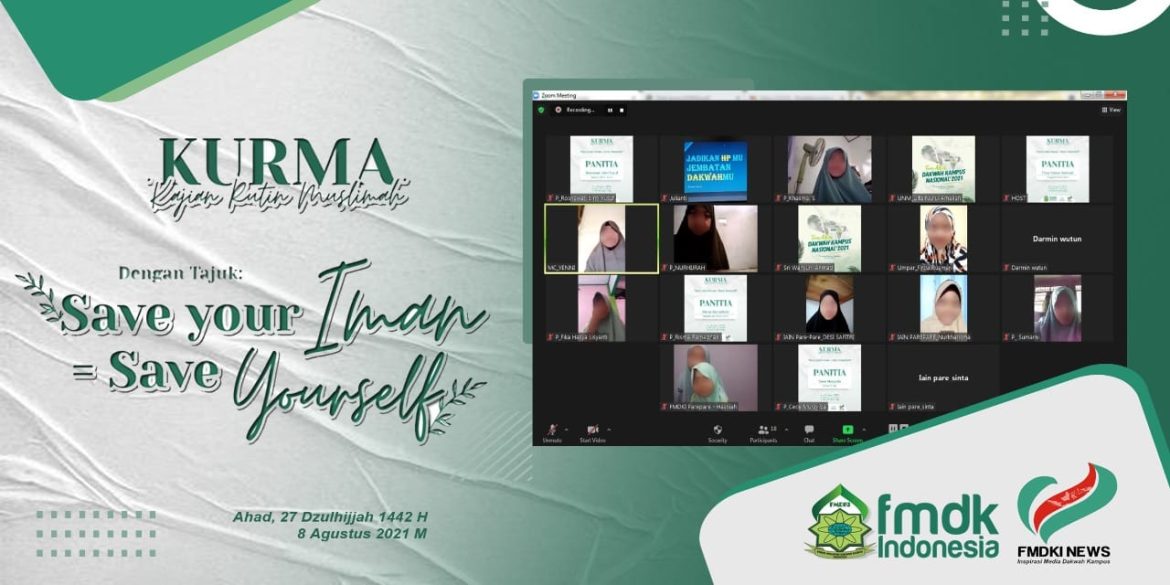 FMDKI.ORG, PAREPARE–Forum Muslimah Dakwah Kampus Indonesia (FMDKI) Daerah Parepare sukses adakan Kajian Rutin Muslimah (KURMA) dengan tema “Save Your Iman = Save Your Self”, Ahad (08/08/21). Kegiatan tersebut berlangsung pukul 08.00-12.30 WITA melalui Zoom Meeting dan dihadiri oleh 34 partisipan muslimah dari berbagai kampus di Kota Parepare. Cece Mursyda, selaku …