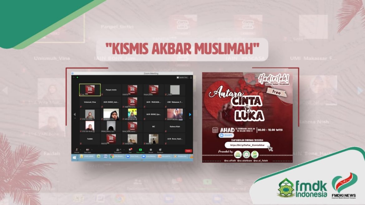 FMDKI.ORG-BONE, Study Club (SC) Fakultas Tarbiyah Institut Agama Islam Negeri (IAIN) Bone gelar Kajian Islam Muslimah Smart (KISMIS), Ahad (13/02/22). Kegiatan ini berlangsung sejak pukul 08.00-12.00 WITA secara Online Via Zoom Meeting yang dihadiri 65 peserta. Mengangkat tema “Antara Cinta dan Luka” kegiatan ini menghadirkan Ustazah Dewi Aisyah Saing, Aktivis …